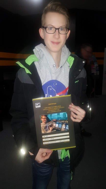 Sogar in einem A380 hebt er nun ab. Als Co-Pilot überfliegt er Hamburg, landet und startet in Paris, kreist um den Eifelturm und macht einen Abstecher in die Alpen.