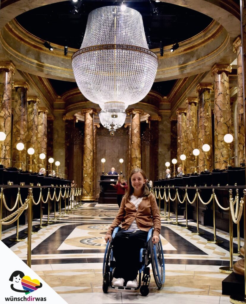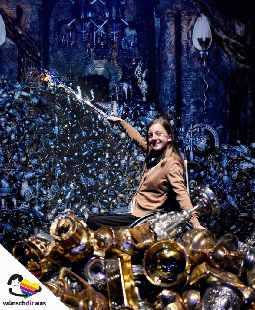 „Ich war schon immer ein riesiger Harry-Potter-Fan. Ich liebe die Filme und vor allem die Hörbücher. Als ich letztes Jahr für 6 Monate im Krankenhaus und in der Reha war, habe ich ständig die Hörbücher gehört, ich kann sie fast auswendig!Also war es mein größter Traum, die Harry Potter Studios bei London zu besuchen. Man sieht dort die Original Film-Sets, Kostüme und erfährt ganz viel über die Hintergründe und die technischen Tricks. Als ich gehört habe, dass ich mir etwas wünschen darf, fiel mir die Entscheidung also nicht schwer ;-). Besonders gut hat mir bei der 4-stündigen Tour die Zauberer-Bank gefallen, weil die so riesig und glamourös ist, mit den Säulen und dem ganzen Gold. Auch die große Halle, in der die Hogwarts-Schüler immer essen, ist ganz toll gemacht. Insgesamt kann man im Rollstuhl alles super angucken und es gibt viele Stationen, wo man Fotos machen darf. Natürlich war es auch sehr aufregend, die Tage in London zu sein. Ich liebe diese coole Stadt und auch die englische Königsfamilie und wir haben irre viel angeguckt.