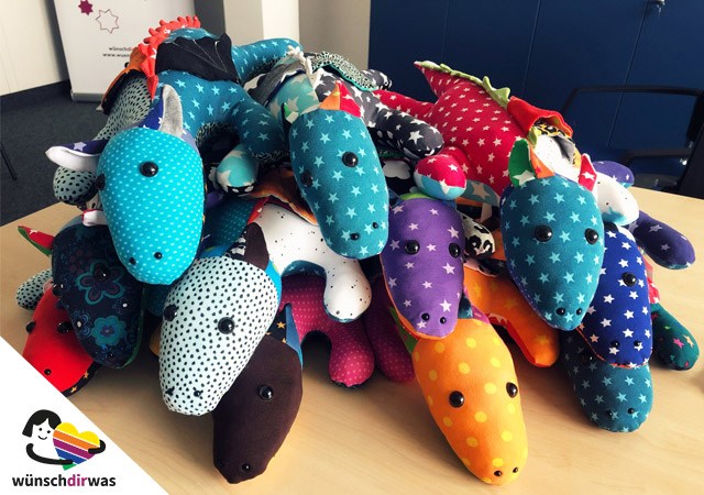 Dank der tollen Arbeit der Künstlerin Angelika Kranefeld, die diese besonderen und sehr knuffigen Drachen herstellt, freuen sich seit kurzem viele unserer Wunschkinder über einen Mut- und Kraftdrachen in ihrem Arm. Wir sind selbst große Fans und warten schon sehnsüchtig auf viele neue bunte und einzigartige Exemplare dieser liebenswerten Drachenart.