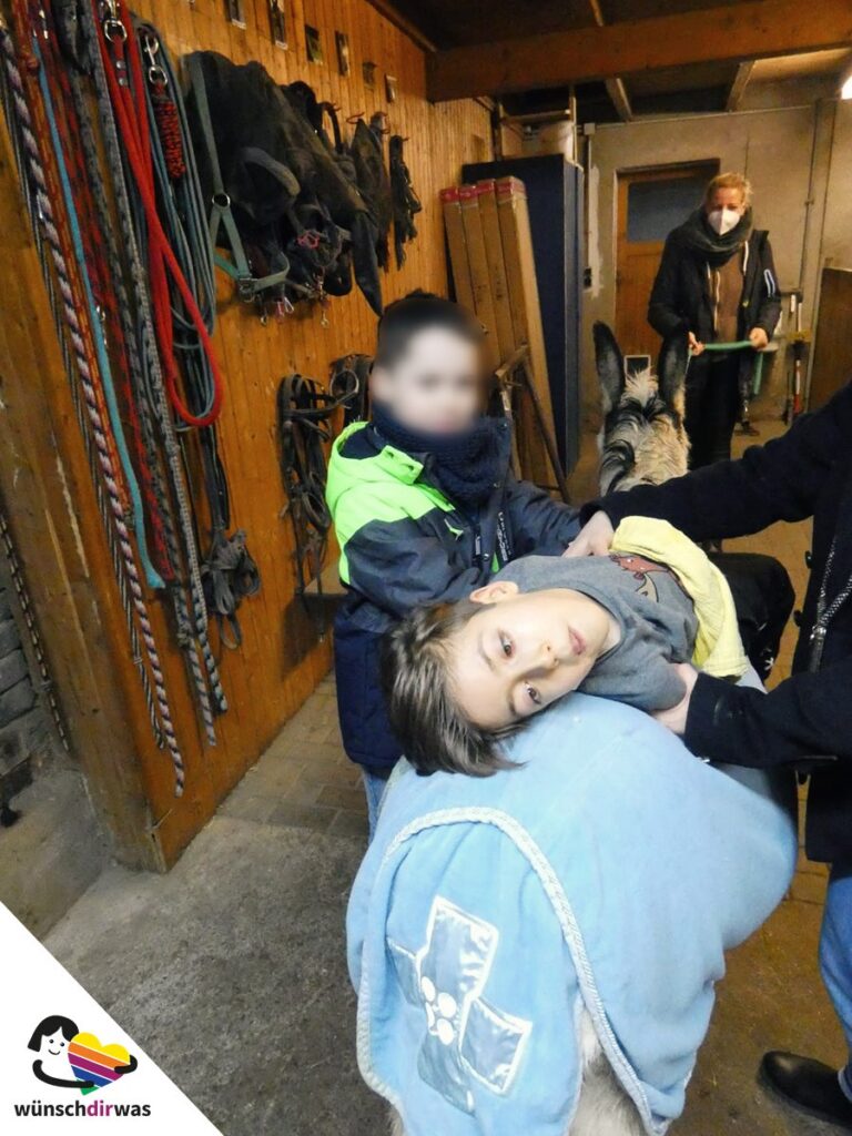 Seit fast einem Jahr macht Kian eine Eseltherapie. Durch das Liegen auf den Eselrücken lernt er das Gleichgewicht zu halten und seine Sinneswahrnehmung zu schulen. Das macht ihm sehr viel Spaß und er freut sich immer riesig auf den Therapiehof zu fahren.
