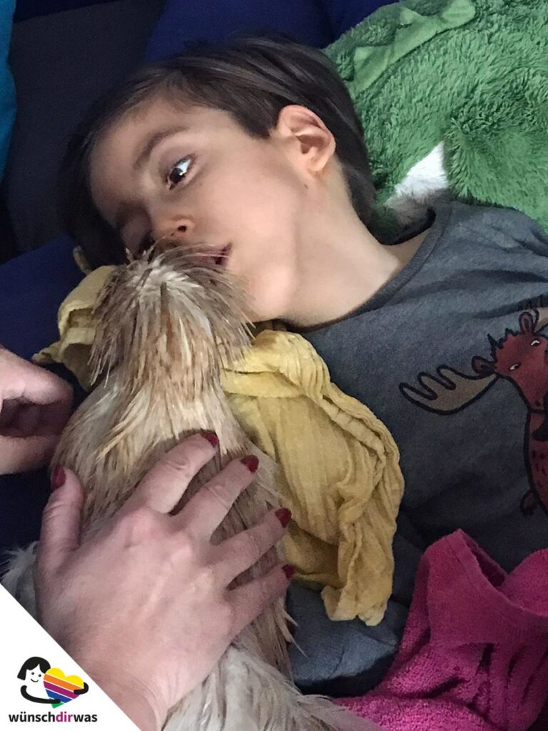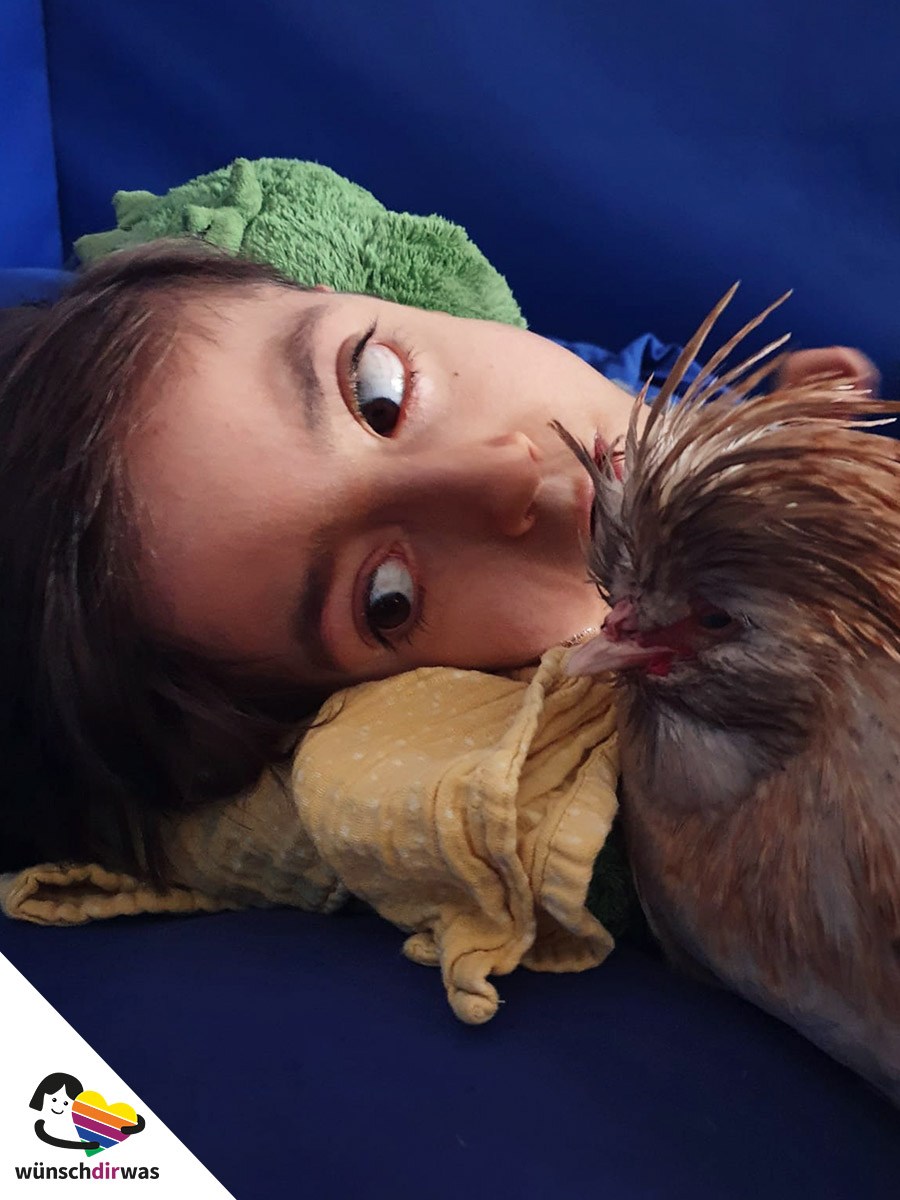 Aufgrund seiner Krankheit hat Kian auch mit seiner Atmung Probleme. Lange Zeit versuchte er als Übung das Pusten zu lernen. Was sich vielleicht leicht anhört, ist für Kian aber gar nicht so einfach. Die unerwartete Lösung kam in Form von Hahn Emil und Henne Maja. Dafür muss man wissen, dass Hühner es sehr mögen angepustet zu werden und diese beiden Exemplare auch extrem gerne kuscheln. Ein kleines Wunder geschah: Kian hat dann tatsächlich in Zusammenarbeit mit Emil und Maja gelernt zu pusten.