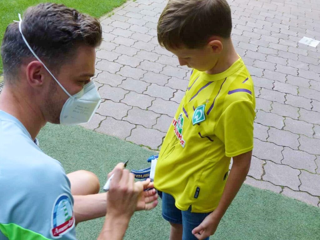 Was soll man bloß sagen, wenn der größte Herzenswunsch sich erfüllt und man plötzlich neben seinem (immerhin fast 2 Meter großen) Torwartidol Jiri Pavlenka steht? Der kleine Bennet entschied sich für schweigen, genießen und selig grinsen 😊 nachdem Bennet coronabedingt fast 1,5 Jahre auf den großen Moment warten musste, konnte er nun endlich ins „wohninvest WESERSTADION“ und Werder Bremen Torwart Jiri Pavlenka persönlich treffen. Und der war so nett, dass Bennet sein Glück gar nicht fassen konnte. Gut, dass er seinen großen Bruder Jaron und Schwester Nela zur Unterstützung dabei hatte. Nach vielen schönen Erinnerungsfotos schenkte Jiri Pavlenka Bennet auch noch ein Trikot, seine aktuellen Fußballschuhe und seine Torwarthandschuhe, die sich Bennet natürlich eingerahmt übers Bett hängen möchte – ein perfekter Tag, den Bennet wohl niemals im Leben vergessen wird.