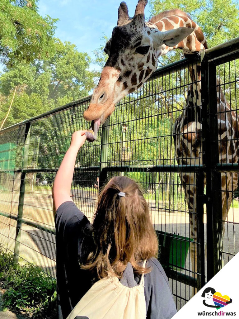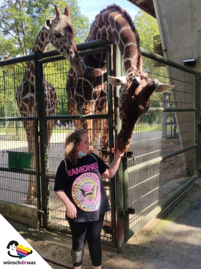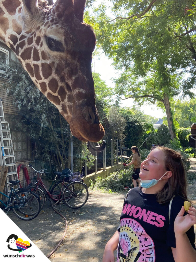 Wussten Sie, dass Giraffen Bananen lieben? Madelaine auch nicht. Seit sie bei ihrer Wunscherfüllung die beiden Giraffen Maru und Koobi im Kölner Zoo mit Bananen füttern durfte und dabei viel über Giraffen erfahren hat, ist Madelaine allerdings richtiger Profi geworden. Nach kurzer Scheu am Anfang vor den wirklich riesigen Tieren, wurde Madelaine schnell mutiger und genoss die ganz besondere Nähe zu den freundlichen Langhälsen in vollen Zügen