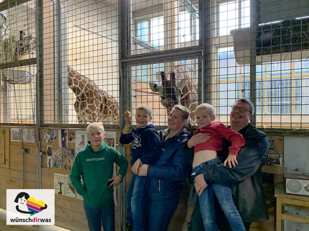 Während seiner Zeit im Krankenhaus schaute Jann-Tjard regelmäßig Tier-Dokumentationen. Vor allem ein Tier begeisterte ihn dabei sehr: die riesige Giraffe. Deshalb wünschte er sich für sich und seine ganze Familie einen Tag im Zoo mit Giraffenfütterung.