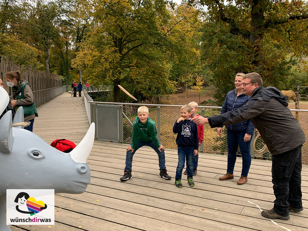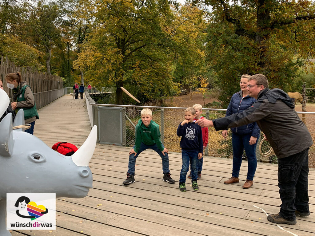 Der Zoo Osnabrück war so freundlich, diesen Wunsch zu erfüllen – vielen Dank für den überaus lieben Empfang vor Ort. Die komplette Familie verbrachte einen ganzen Tag zwischen wilden Tieren und lustigen Spielen. Beim Ringe werfen auf das Plastiknashorn holte Jann-Tjards Papa sogar den Hauptpreis und alle haben viel gelacht.