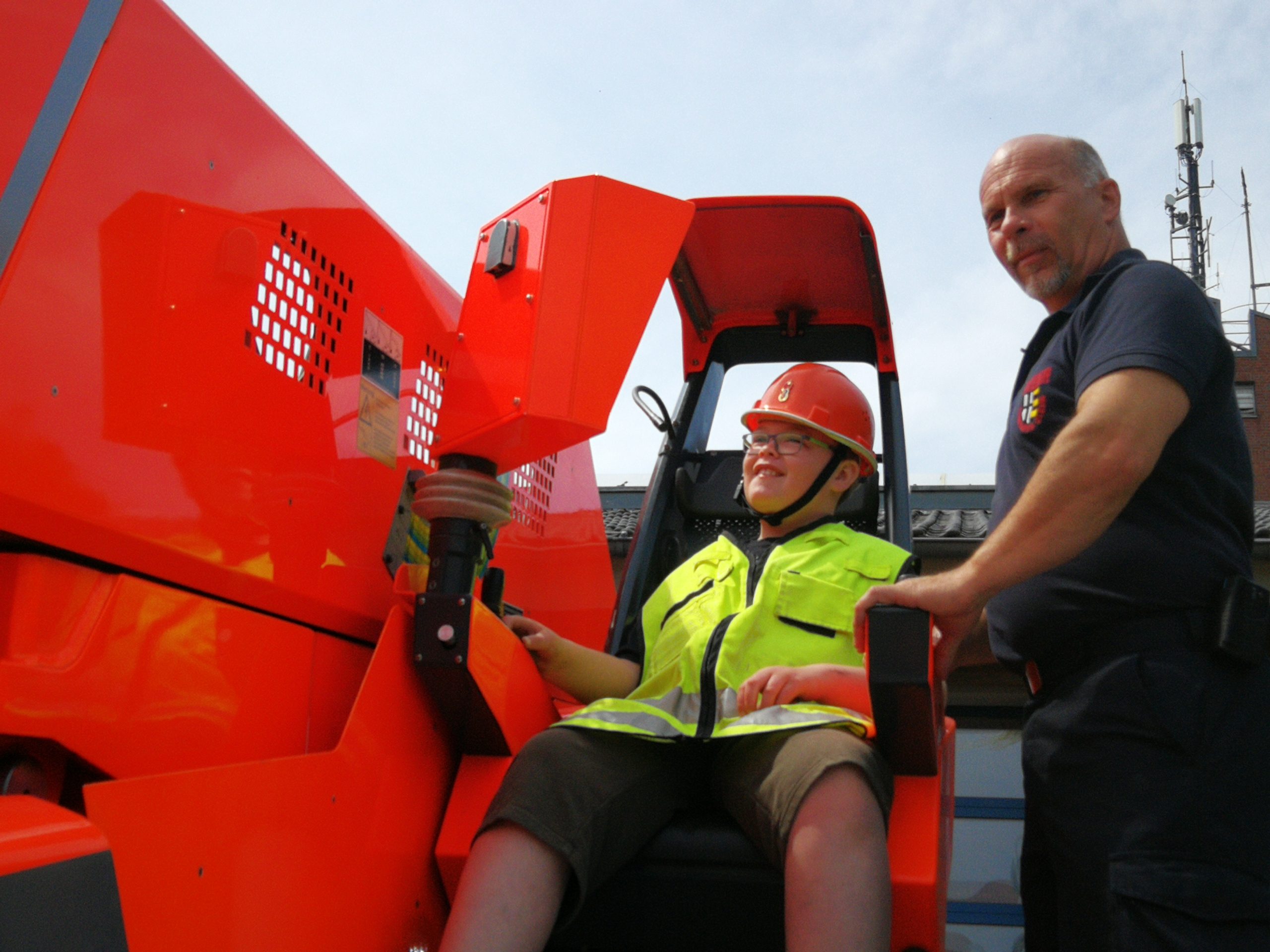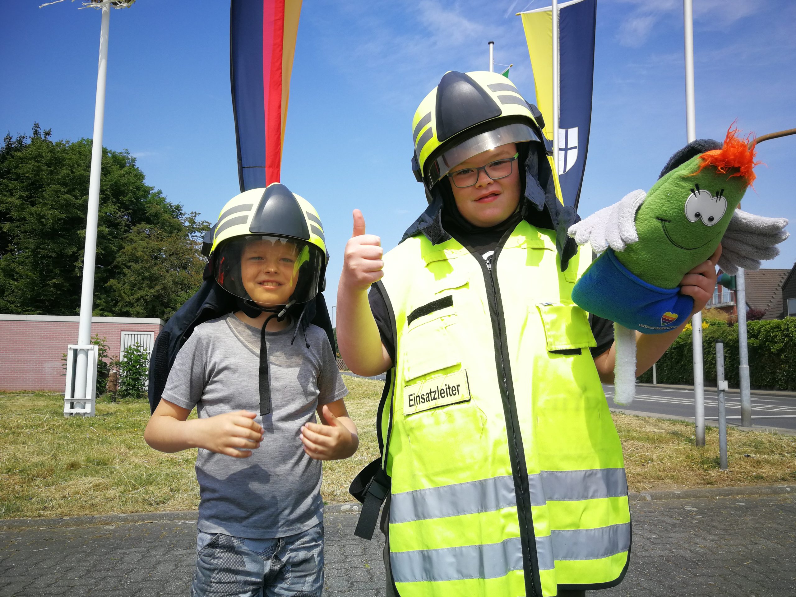 Als Nächstes durfte dann sein Bruder Jan in den Korb und Finn saß am Steuergerät, um Jan in die Höhe zu fahren. Auch das war natürlich super cool. Im Anschluss bekamen die beiden Jungs noch echte Feuerwehrhelme geschenkt, die bei Einsätzen getragen wurden. Finn hat den Helm sofort aufgesetzt und später nur unter großem Protest in der Eisdiele wieder ausgezogen. Die freiwillige Feuerwehr hat sich richtig toll und die Jungs gekümmert und alles dafür getan, um Finn einen unvergesslich schönen Tag zu bescheren. Ganz lieben Dank an alle Mitwirkenden.