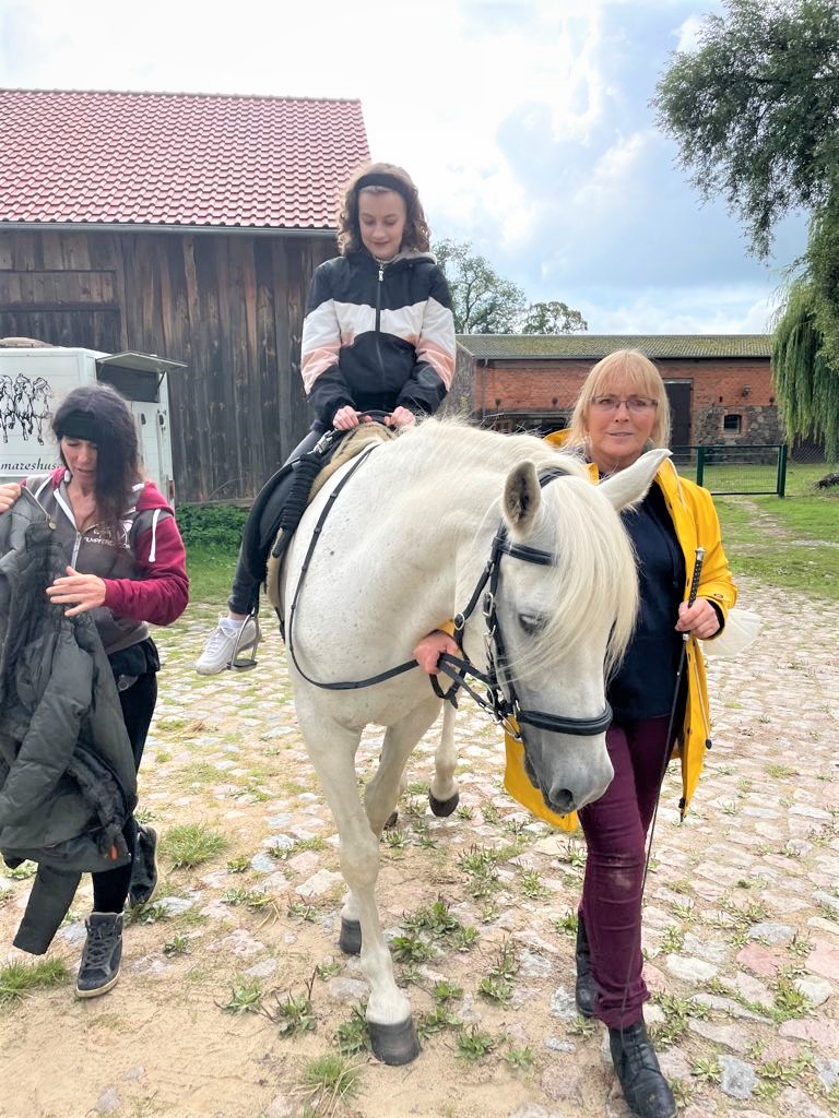 Es war unendlich spannend, obwohl eine Szene mehrmals gedreht werden musste, bis sie im Kasten war. Bei der ersten Szene durfte ich schon mitspielen. Ich habe gezittert, wollte nichts falsch machen und mein Herz pochte wie verrückt. Wir sind mit dem Auto gefahren und plötzlich ging es nicht mehr weiter, die Straße war gesperrt. Ich bin ausgestiegen und habe mich sehr verwundert umgesehen, denn es hieß, hier sei ein Ufo gelandet. Es war unfassbar schön, ich war sehr aufgeregt und konnte mein Glück noch gar nicht fassen. Das gesamte Team hat sich rührend um mich und meine Mama gekümmert. Nach der ersten Szene ging es dann weiter zu einem Schloss. Die anderen Komparsen wurden verabschiedet, ich durfte jedoch mitkommen und im Schloss den weiteren Dreh beobachten. Auf dem Weg dorthin hatte ich die Ehre auf Bibis Pferd Sabrina zu reiten. Ich liebe Pferde und hätte es mir nie träumen lassen mal auf so einem prominenten Pferd sitzen zu dürfen. Ich konnte nicht genug bekommen und hätte die Zeit am liebsten angehalten. Trotz Regen und Kälte wollte ich mir alles genau bis zum Drehende ansehen. Irgendwann hieß es jedoch Abschied zu nehmen. Wenka von Mikulicz fuhr uns zum Hotel zurück und zeigte uns bei dieser Gelegenheit die schönsten Ecken von Berlin. Rückblickend kann ich sagen, es war neben meiner Gesundung der schönste Tag meines Lebens. Ich bin Frau Stenschke von „wünsch dir was“, sowie allen Beteiligten, die zur Erfüllung meines Herzenswunsches beigetragen haben unendlich dankbar. Sie haben so viel Mühe und Herzblut in die Erfüllung meines Wunsches gesteckt, dass ich Sie alle am liebsten ganz fest drücken möchte. Dies tue ich hiermit aus der Ferne, bleiben Sie alle gesund, ich werde Sie nie vergessen. HERZLICHEN DANK! Ihre Elaine