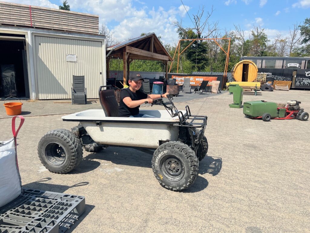 Eine aufregende Erfahrung war die Möglichkeit, eine umgebaute Mülltonne zu fahren. In einem wahrlich unkonventionellen Gefährt düste Ben durch das Gelände. Aber das war noch nicht alles. Eine weitere unvergessliche Erfahrung war die Fahrt mit Johannes in einer Quad-Badewanne durch den Wald. Mit Lachen im Gesicht wurde diese ungewöhnliche Fahrt zu einem wahren Highlight des Tages.