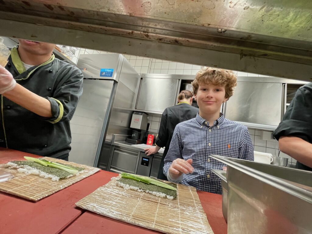 Danach ging es zur Nigiri-Sushi-Station: Emilio lernte jede Menge Tricks, wie man die kleinen Reishäppchen mit Beilage am besten formt und erledigte seine Aufgaben fachmännisch und souverän. Dann durften die köstlichen selbst gemachten Speisen bei herrlichem Panoramablick gekostet werden.
