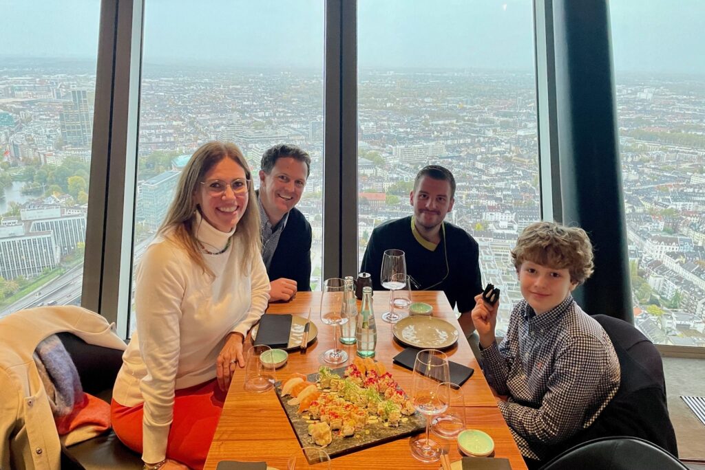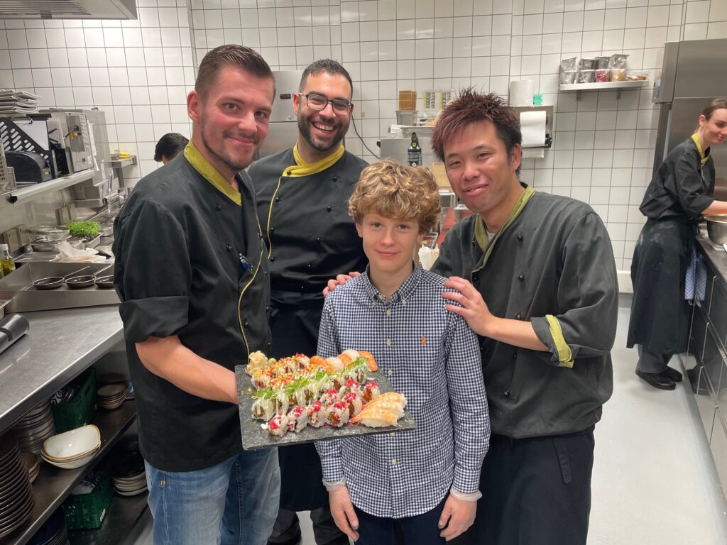 Das durfte er im QOMO-Restaurant im Düsseldorfer Rheinturm. Küchenchef Markus Gasz begrüßte den Zehnjährigen und dessen Eltern sehr herzlich und dann ging es an die Arbeit! Nachdem die Hände gewaschen und die Schutzhandschuhe angezogen waren, begann für Emilio die erste Sushi-Station: Inside-Out-Rolls, natürlich mit seinem Lieblingsfisch Lachs!