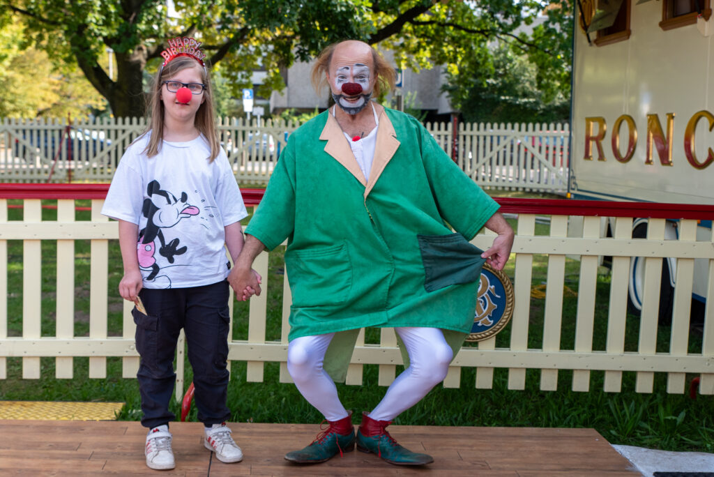 Dann kam plötzlich lautstark der lustige Clown mit einem Käfig zu uns und machte Späße, über die alle herzhaft lachen mussten. Lina freute sich sehr über diese besondere Aufmerksamkeit.