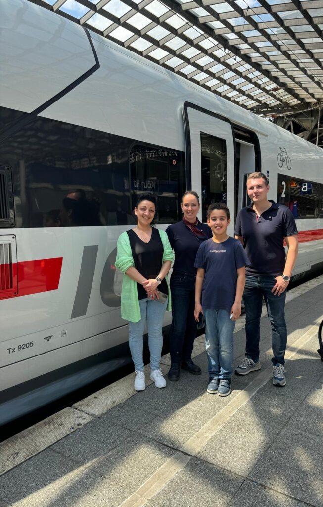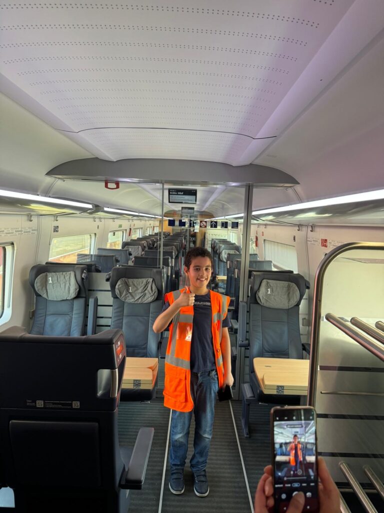 Nach diesem tollen Erlebnis im DB-Simulator ging es weiter. Die Gruppenleiterin Triebfahrzeugführer Frau Dresens-Bruls und Alexander Neeten hatten sich für Romeo noch etwas Besonderes einfallen lassen: Am Hauptbahnhof Köln durften alle in einen gerade angekommenen ICE einsteigen, der für die Weiterfahrt erst gereinigt und vorbereitet werden musste. Es war der von Romeo heißgeliebte und gewünschte ICE 4. Fachmännisch hatte er allen erklärt, dies wäre der neueste ICE, der ICE 3 wäre ja schon eine ältere Generation. Natürlich durfte Romeo in den Lokführerstand und zuschauen, wie Alexander Neeten den Zug fuhr.
