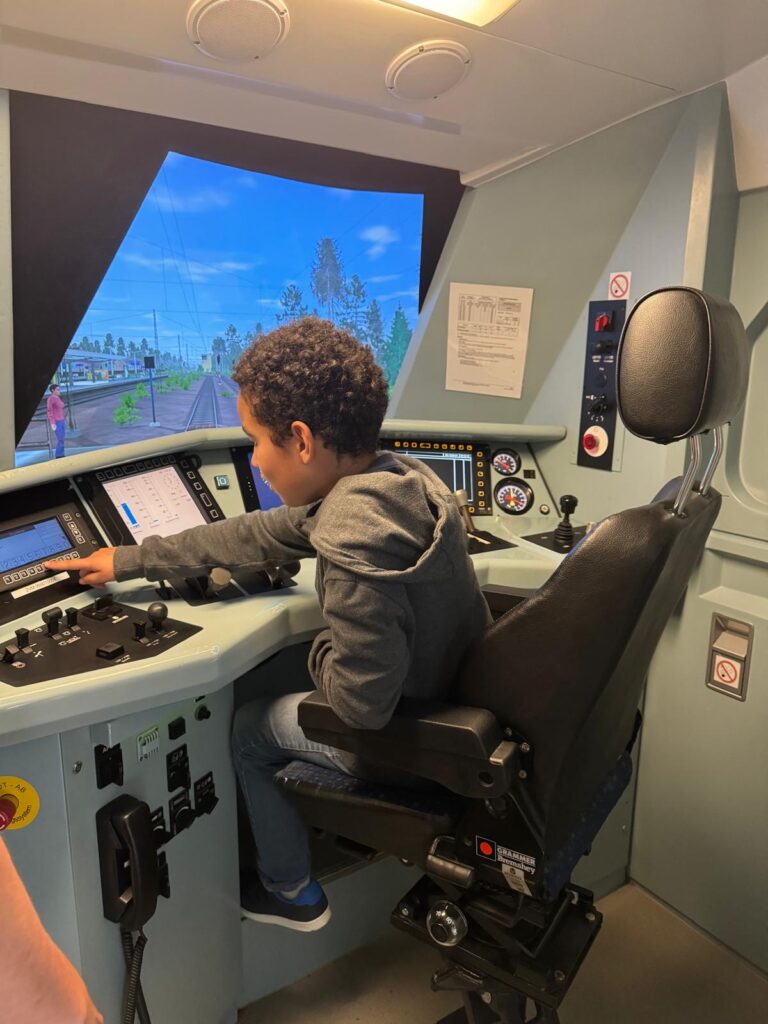 Dann kam der erste große Moment: Einlass in den DB-Simulator, wo Romeo direkt auf dem Zugführerplatz Platz nehmen durfte. Alexander Neeten erklärte ihm zuerst die Funktionen von einigen Schaltern, Knöpfen und Pedalen. Romeo lernte, wie man anfährt, bremst und Geschwindigkeiten hält oder drosselt. Dann ging es los. Romeo durfte losfahren!