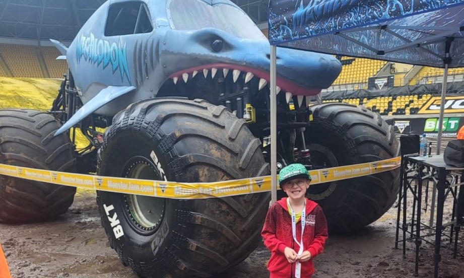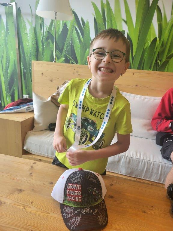 Dann ging plötzlich die Tür auf und alle Fahrer:innen der „Monster Trucks“ kamen herein: Black Panther, Thor, El Toro Loco und MAX-D standen da mitten im Raum. Louis war völlig perplex und wusste gar nicht, wo er zuerst hingucken sollte. Alle waren unglaublich nett, gingen rührend auf Louis ein und nahmen sich richtig viel Zeit. Toll!