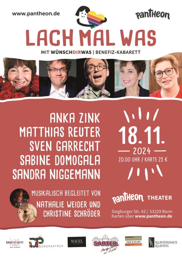 Am Montag, 18. November 2024 findet zum 12. Mal unser beliebter Kabarett-Comedy-Benefizabend „Lach mal was mit wünschdirwas“ im Pantheon-Theater Bonn statt.