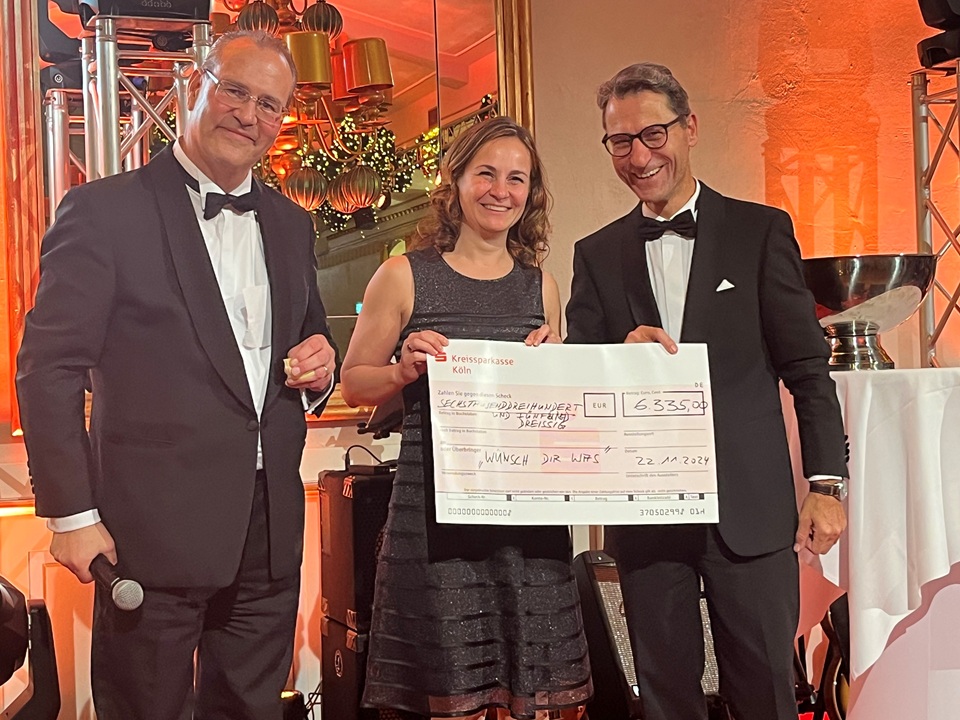 Herzlichen Dank für die tolle Spende von 6.335 Euro, die durch den Tombola-Losverkauf für wünschdirwas e.V. auf der 11. Gala Kölner Juristen 2024 des Kölner Anwaltverein e.V. zusammengekommen ist. Unsere ehrenamtliche Vorstandsvorsitzende Nina Saure nimmt den symbolischen Spendenscheck für unseren Verein entgegen, links im Bild Rechtsanwalt Markus Trude, Vorsitzender des Kölner Anwaltverein e. V., rechts im Bild Rechtsanwalt Dr. Jörg Luxem, Schatzmeister des Kölner Anwaltverein e. V. Davon werden wir die Herzenswünsche vieler schwer und chronisch erkrankter Kinder und Jugendlicher erfüllen und unbezahlbare Glücksmomente schenken.