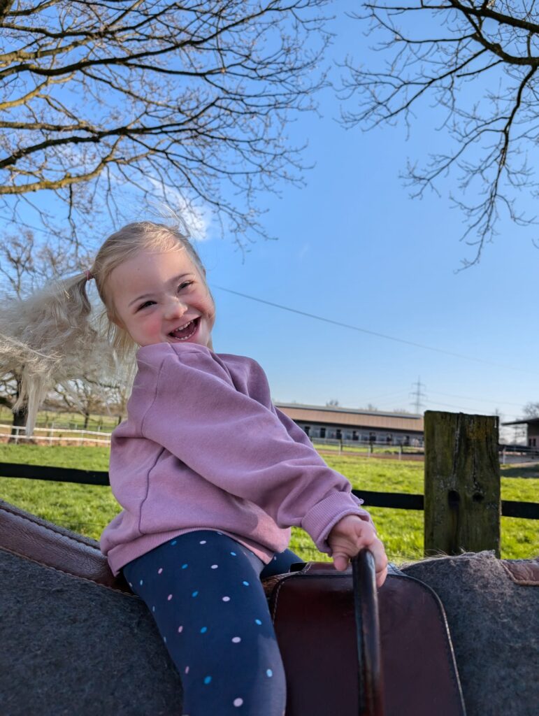 „Meine Tochter kommuniziert durch Gebärdensprache und schnalzt vor Freude aufgeregt mit der Zunge, wenn sie in die Nähe des Pferdes kommt“, erzählt ihre Mutter. Wie toll, Phina!!! Ganz viel Spaß noch bei deinen weiteren Reittherapiestunden.