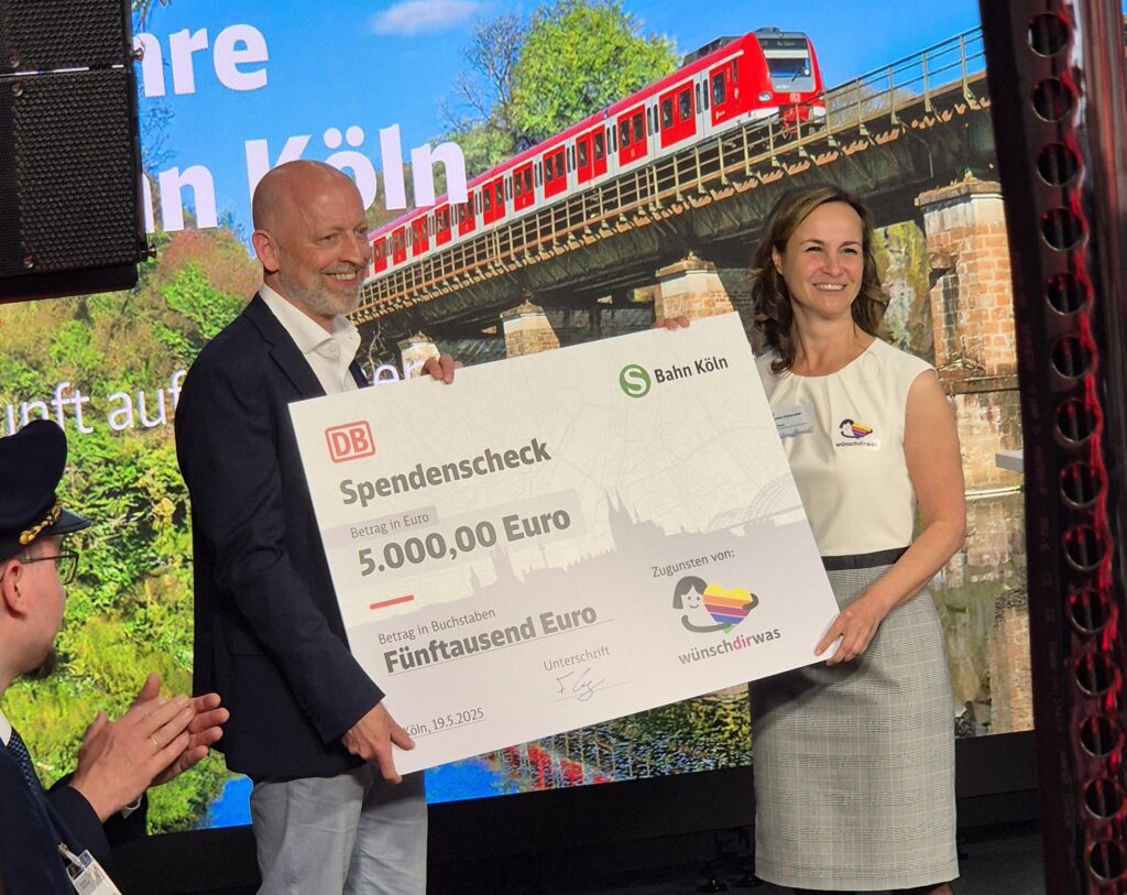 Anlässlich des 50. Geburtstages der S-Bahn Köln erhielt wünschdirwas e.V. einen Spendenbetrag in Höhe von 5.000 Euro, wofür wir uns von Herzen bedanken möchten. Frederik Ley, Vorsitzender der Regionalleitung DB Regio NRW, überreichte unserer ehrenamtlichen Vorstandsvorsitzenden Nina Saure auf der Geburtstagsveranstaltung den symbolischen Spendenscheck. Wir freuen uns riesig!