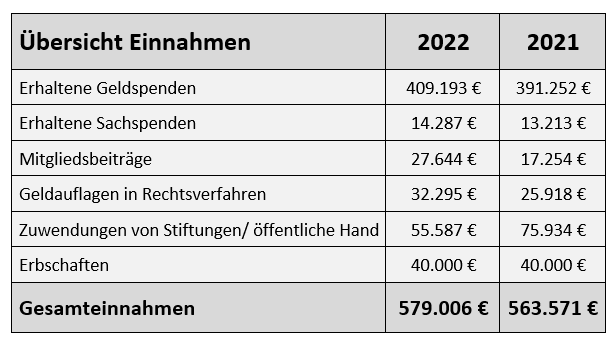 Erfreulicherweise konnten die Einnahmen in 2022 gegenüber dem Vorjahr gesteigert werden – in nahezu allen Bereichen. Lediglich bei Zahlungseingängen von Stiftungen und der öffentlichen Hand musste ein Rückgang verzeichnet werden.