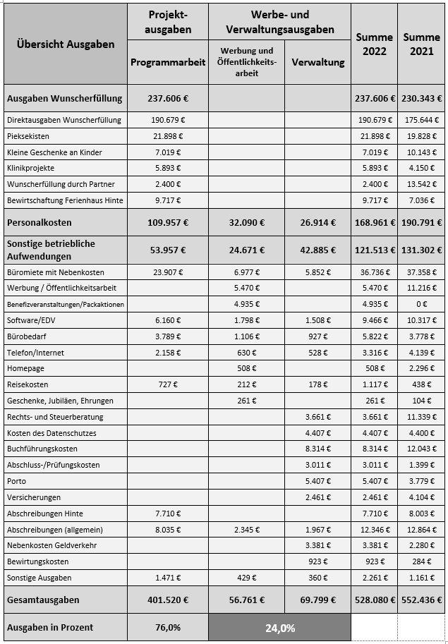 Dank der erfreulichen Entwicklung bei den Einnahmen und sinkenden Ausgaben für Werbung/Öffentlichkeitsarbeit und Verwaltung stehen dem Verein wieder höhere finanzielle Mittel für die direkte Programmarbeit zur Verfügung. Diese sollen dazu genutzt werden, noch mehr besondere Erlebniswünsche, den Kern der Vereinstätigkeit, erfüllen zu können.