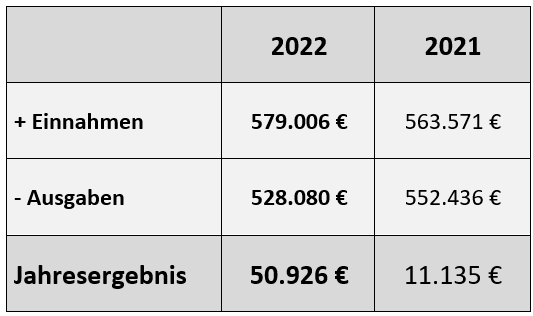 Die im Vorjahr deutlich niedrigeren Einnahmen durch Mitgliedsbeiträge erklären sich durch die in 2021 erfolgte Umstellung des jährlichen Abbuchungszeitpunkts. Zur Vereinfachung der Buchhaltung werden seit 2022 alle Mitgliedsbeiträge im Januar fällig. Mitglieder, die in anderen Monaten in den Verein eingetreten waren, mussten daher in 2021 nur den anteiligen Beitrag bis zum Jahresende entrichten.