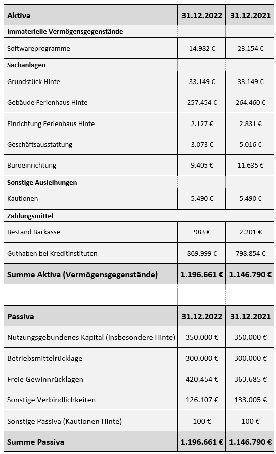 Beim nutzungsgebundenen Kapital handelt es sich zum Großteil um das im Ferienhaus in Hinte gebundene Vermögen. Die Betriebsmittelrücklage deckt die wiederkehrenden Zahlungsverpflichtungen (wie z.B. Gehälter, Mieten) für den Zeitraum eines Jahres ab. Die freien Gewinnrücklagen sind nach § 62 Abs.1, Nr. 3 AO zulässig gebildete Ersparnisse ohne Zweckbindung, die der Verein zu einem späteren Zeitpunkt für satzungsbedingte Zwecke verwenden darf. Die Sonstigen Verbindlichkeiten bestehen im Wesentlichen aus in 2022 bereits bewilligten Wunscherfüllungen und Therapien, deren Zahlungen aber erst in der Zukunft anfallen werden.