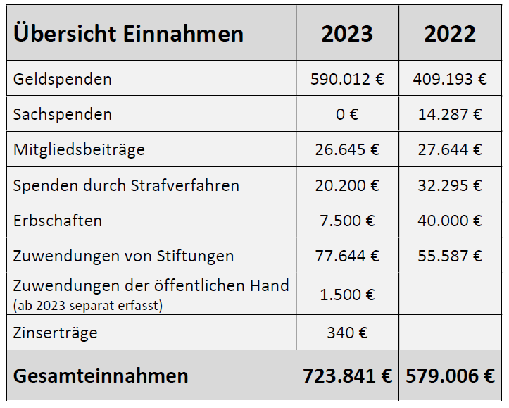 Erfreulicherweise konnten die Einnahmen in 2023 gegenüber dem Vorjahr deutlich gesteigert werden – insbesondere im Bereich der Geldspenden (+44 %). Hierbei machte sich die Unterstützung der Roten Funken, die in 2023 das Dreigestirn im Kölner Karneval gestellt haben, deutlich bemerkbar. Deren Einzelspende über 90.000 € war in 2023 die einzige, die mehr als 10 % der gesamten Jahreseinnahmen ausgemacht hat.