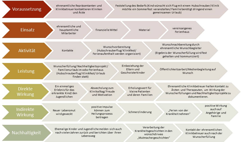 Regionaler ehrenamtlicher Repräsentant arbeitet ehrenamtliche Klinikbetreuer ein → Kontaktaufnahme und Kontaktpflege zum Klinikpersonal/ zu Ärzten/ Pflegern/ Sozialdiensten → Sondierung des Bedarfs für Nachhaltigkeitsprojekte, individuelle Wunscherfüllungen oder Ferienaufenthalte im vereinseigenen Ferienhaus → Meldung des Bedarfs und der individuellen Kinderwünsche an das Kölner wünschdirwas-Büro.